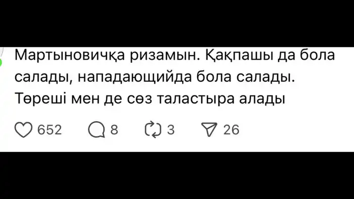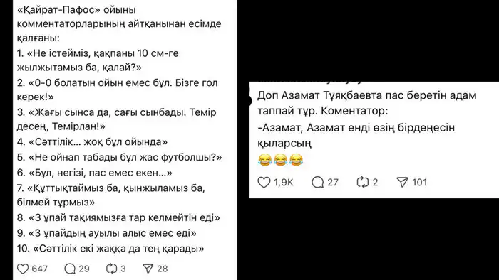 Особое внимание казахстанцев привлекла работа спортивных комментаторов, чьи выразительные фразы стали объектом обсуждения. Некоторые пользователи даже предложили создать сборник цитат под названием "Футбол, который мы заслужили".