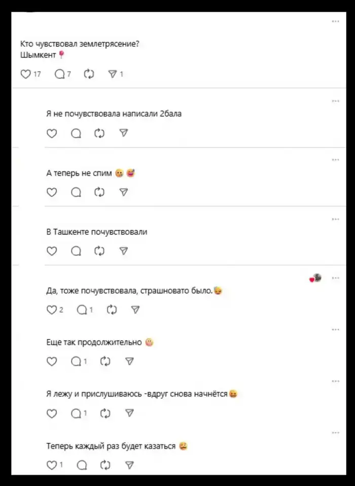 "Да, тоже почувствовала, страшновато было", "Слабенькое было, но в многоэтажке ощутимое. В частных домах, наверное, вообще незаметно", "Я в параллельном Шымкенте живу? Который раз не чувствую", "Да, почувствовали немного… страшно, даже если слабое" — делились своими впечатлениями пользователи.