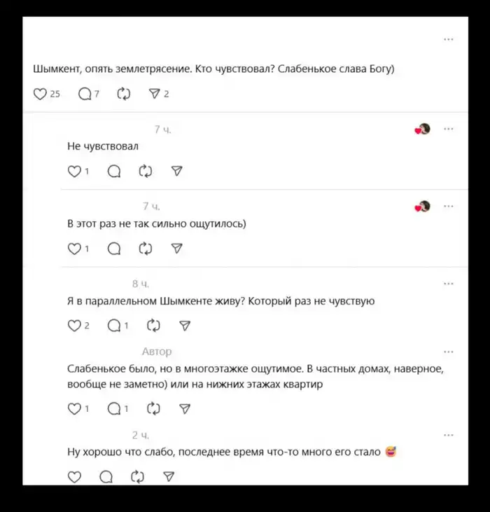 Жители Шымкента успокаивали друг друга в комментариях, подчеркивая отсутствие серьезных последствий. Однако многие отметили, что в последние месяцы подобные толчки стали происходить чаще.
