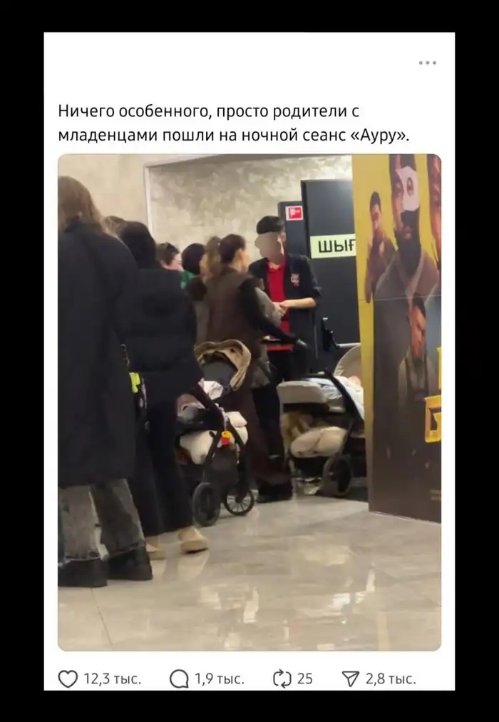 В Казахстане разгорелась активная дискуссия в социальных сетях по поводу инцидента, связанного с ночным показом фильма с возрастным ограничением 21+. Некоторые родители пришли на сеанс с младенцами и детьми в возрасте до пяти лет, что вызвало недоумение у пользователей.