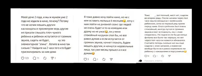 В комментариях пользователи выделили несколько причин, вызывающих обеспокоенность по поводу таких ситуаций: позднее время, громкий звук, сезонные заболевания, формат фильма и возрастное ограничение 21+. Также есть риск, что ребенок может начать плакать, что отвлечет остальных зрителей.