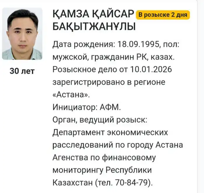 По данным, опубликованным на интернет-портале, розыск продолжается второй день. Кайсар Камза родился 18 сентября 1995 года, а дело о его розыске зарегистрировано 10 января 2026 года в регионе Астана.