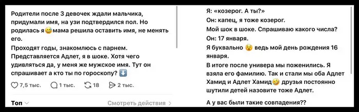 "Родители после трёх девочек ждали мальчика и придумали имя, на УЗИ подтвердился пол. Но родилась я, и мама решила оставить имя, не менять его. Прошли годы, я познакомилась с парнем. Он представился как Адлет, и я была в шоке, хотя чему удивляться, у меня же мужское имя", — написала она.