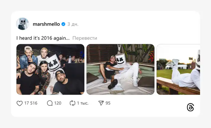 Тренд быстро подхватили и знаменитости. К примеру, диджей Marshmello опубликовал пост с подписью "I heard it’s 2016 again…" и собрал тысячи лайков.