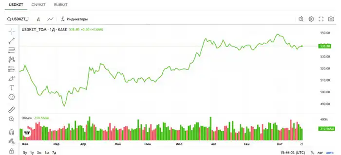 На Казахстанской фондовой бирже (KASE) по состоянию на 15:30 по времени Астаны средневзвешенный курс доллара составил 538,53 тенге, что на 0,08 тенге ниже предыдущего значения. Официальный курс Национального банка на 22 октября составляет 538,56 тенге за доллар.