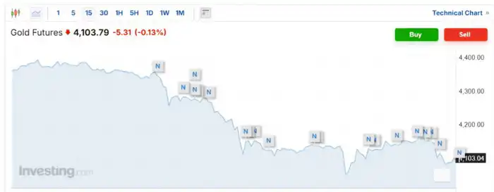 Золото продолжает дешеветь, так как инвесторы переключаются на другие активы на фоне укрепления доллара и роста доходности казначейских облигаций США. Фьючерс на золото снизился на 0,13 процента, достигнув 4 103,79 доллара за унцию.