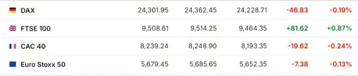 Европейские рынки продемонстрировали смешанную динамику. Индексы DAX и CAC 40 снизились под давлением слабых корпоративных отчетов и повышенной геополитической неопределенности, в то время как FTSE 100 вырос благодаря более низким, чем ожидалось, данным по инфляции в Великобритании, что уменьшило риск повышения ставок. Euro Stoxx 50 снизился на 0,13 процента, DAX - на 0,19 процента, CAC 40 - на 0,24 процента, в то время как FTSE 100 показал рост на 0,87 процента.