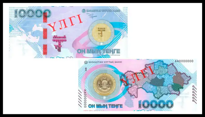 На фото — юбилейная банкнота номиналом 10 000 тенге, выпущенная в ноябре 2023 года к 30-летию национальной валюты. На лицевой стороне изображены монета с гербом Казахстана и "лента Мёбиуса". На оборотной стороне — монета со знаком тенге, "лента Мёбиуса" и контур государственной границы Казахстана на карте Евразии.
