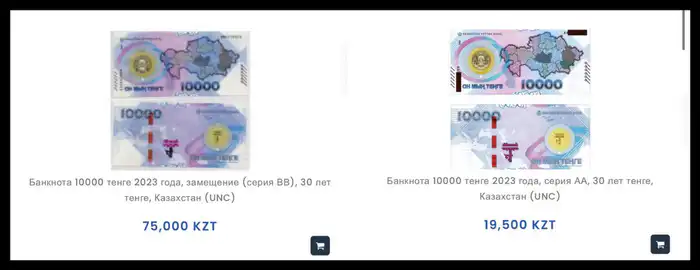 Анализируя актуальные предложения на одном из сайтов по продаже коллекционных монет и банкнот, можно заметить, что цены на юбилейную купюру номиналом 10 000 тенге варьируются от 19 500 до 75 000 тенге. Такой разброс объясняется серией выпуска: редкая серия BB оценивается значительно выше, в то время как более распространённая серия AA продаётся примерно за 19 500 тенге.