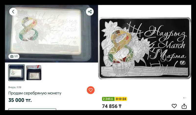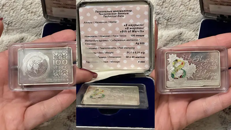 По информации Нацбанка, речь идёт о коллекционной монете "8 Марта" номиналом 100 тенге из серии "Монета-подарок", выпущенной в 2015 году. Эта монета имеет квадратную форму, а на её аверсе изображён стилизованный цветок в обрамлении сургучной печати с надписями "Нацбанка". В центре — герб Казахстана, а справа — орнаментальная розетка, номинал, год чеканки и отметка пробы.