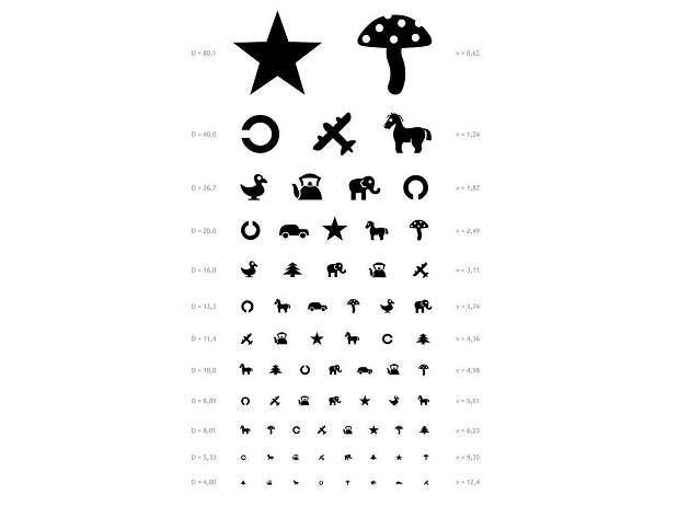 Первичная диагностика основывается на проверке остроты зрения каждого глаза. Эта процедура называется визометрией и занимает всего несколько минут. В процессе диагностики используются специальные таблицы с буквами, цифрами и изображениями. Пациент должен находиться на определенном расстоянии от таблицы и читать строки, указываемые врачом. Обследование каждого глаза проводится поочередно, при этом закрывается один глаз в момент проверки.