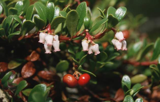 Цветение кустарника происходит с мая по июнь, когда на нем распускаются маленькие розовые цветы, которые превращаются в кислые красные ягоды к осени. Однако основная ценность толокнянки заключается не в ягодах. Цветы и плоды не так богаты биологически активными веществами, как ее листья и побеги.