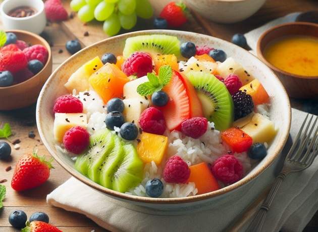 - Полдник: фруктовый салат с рисом и йогуртом.
