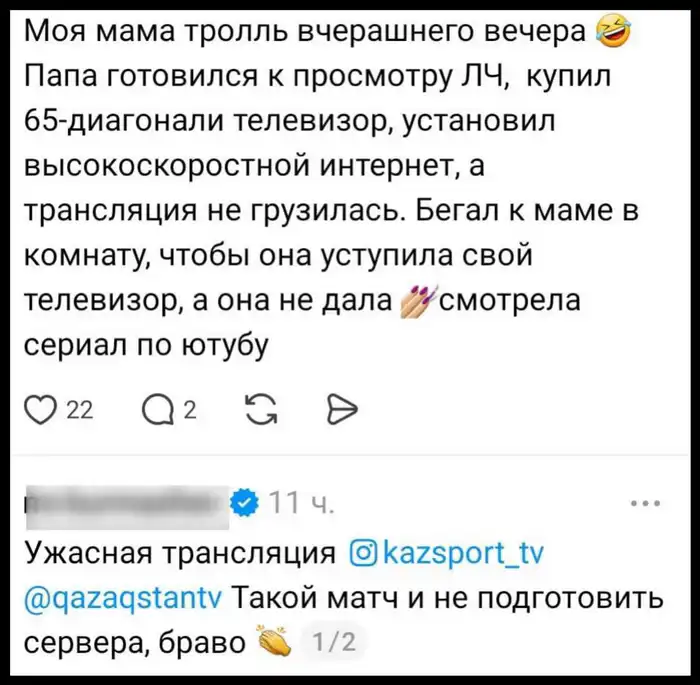 Накануне в Алматы на стадионе "Центральный" прошла историческая встреча: местный "Кайрат" провел первый домашний матч общего этапа Лиги чемпионов против мадридского "Реала". Значительная часть фанатов "Кайрата" не успела купить билеты, и многие решили смотреть матч дома или в кафе и ресторанах, готовя клубную атрибутику: шарфы, футболки, флаги. Атмосфера праздника ощущалась ещё до начала игры, однако с первых минут встречи появились жалобы в соцсетях на качество трансляции на некоторых казахстанских телеканалах.
