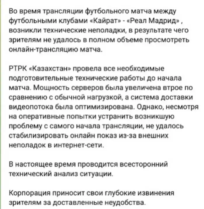 "Во время онлайн-трансляции матча "Кайрат" - "Реал Мадрид" произошёл сбой на платформе ТРК "Казахстан" из-за большого количества пользователей. Временно были недоступны сайты qazaqstan.tv, qazsporttv.kz, а также приложения BeeTV, TV+ и другие", - сообщили в ведомстве.