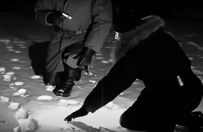 Эта находка запускает финальный акт истории. Место убийства оцепляют, следователи находят в снегу улику: алюминиевую пуговицу.
