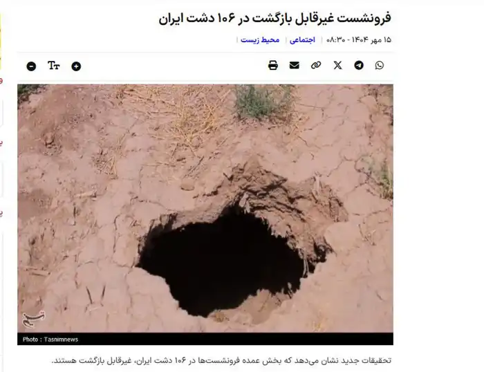 Ещё одно сообщение посвящено просадке грунта: тысячи иранцев сейчас находятся на потенциально опасных территориях, которые могут обвалиться в любой момент. Чрезмерное использование подземных вод привело к тому, что под землёй образовались пустоты.
