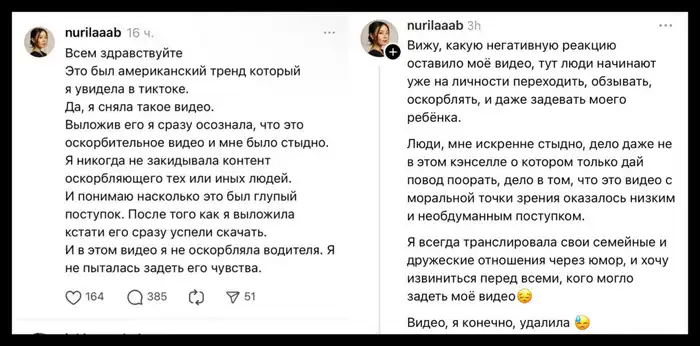 "Это был американский тренд, который я увидела в TikTok. Да, я сняла такое видео. Выложив его, я сразу осознала, что это оскорбительное видео, и мне было стыдно. Я никогда не закидывала контент, оскорбляющий тех или иных людей. И понимаю, насколько это был глупый поступок. После того как я выложила, кстати, его сразу успели скачать. И в этом видео я не оскорбляла водителя. Я не пыталась задеть его чувства", — написала она в комментариях к посту.