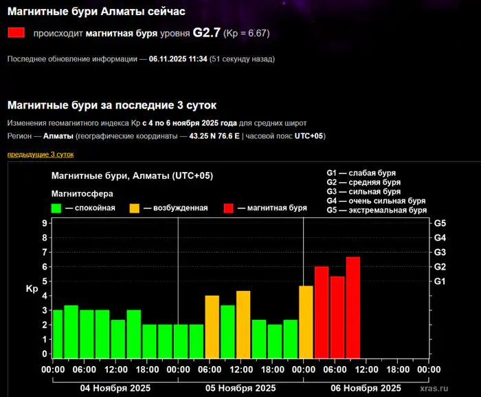 По предварительным расчётам, основное воздействие придётся на ночь с 6 на 7 ноября и утро пятницы. Уже сейчас, по данным мониторинга XRAS.ru, в Алматы зарегистрирована буря уровня G2.7 и показатели продолжают расти.