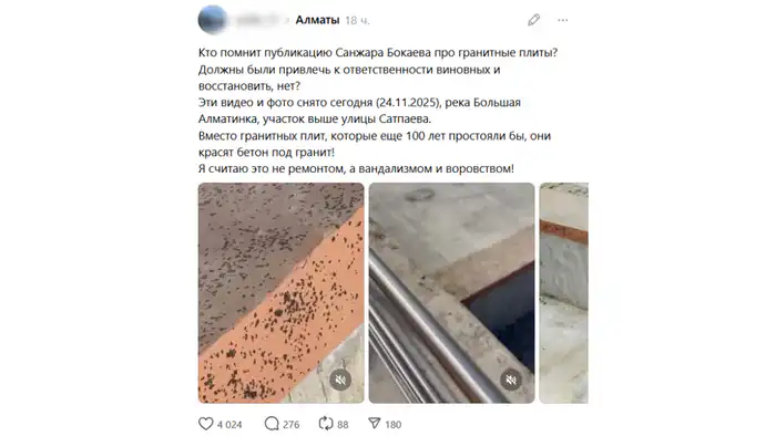 "Эти видео и фотографии сняты 24 ноября. Река Большая Алматинка, участок выше улицы Сатпаева. Вместо гранитных плит, которые ещё 100 лет простояли бы, они красят бетон под гранит! Я считаю это не ремонтом, а вандализмом и воровством!"