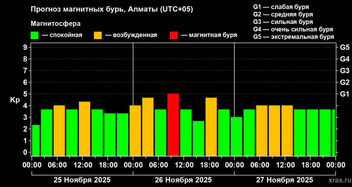По данным специалистов, 26 ноября с 6:00 до 12:00 ожидается магнитное возмущение уровня G1, что классифицируется как "слабая" геомагнитная буря.