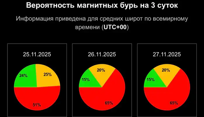 На 26 ноября буря не прогнозируется, однако существует вероятность геомагнитных колебаний в размере 65%. Риск небольших возмущений составляет 20%, а спокойная обстановка ожидается всего в 15% случаев.