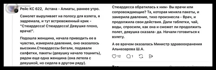 Инцидент на борту самолёта: пассажирка с плохим самочувствием привёл к видеозаписи с министром Альназаровой