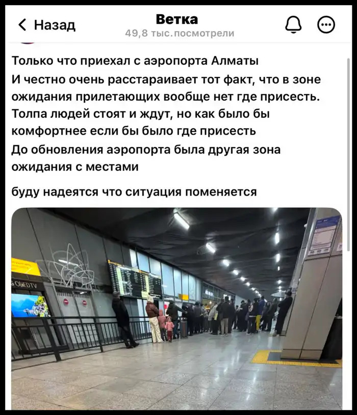 "Только что приехал из аэропорта Алматы, и, честно, очень расстраивает, что в зоне ожидания прилетающих почти нет мест, где можно присесть. Люди стоят в толпе и ждут, и было бы гораздо комфортнее, если бы такие места были. До обновления аэропорта была другая зона ожидания с креслами — буду надеяться, что ситуация изменится", — сообщил автор поста.