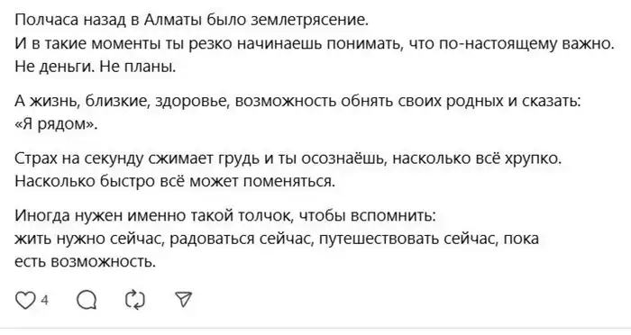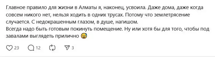 "Главное правило для жизни в Алматы я, наконец, усвоила. Даже дома нельзя ходить в одних трусах. Потому что землетрясение случается — с недокрашенным глазом, в душе, нагишом. Всегда надо быть готовым покинуть помещение. Ну или хотя бы для того, чтобы под завалами выглядеть прилично", — пошутила автор поста.