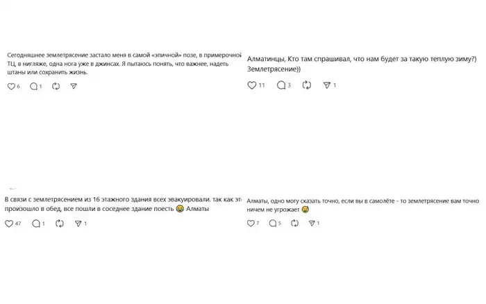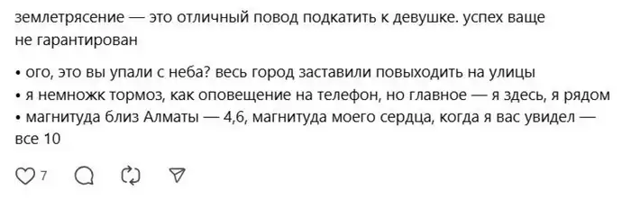 "Землетрясение — это отличный повод подкатить к девушке. Успех вообще не гарантирован. "Ого, это вы упали с неба? Весь город заставили повыходить на улицы". "Я немножко тормоз, как оповещение на телефон, но главное — я здесь, я рядом". "Магнитуда близ Алматы — 4,6, магнитуда моего сердца, когда я вас увидел — все 10", — говорится в одном из постов.