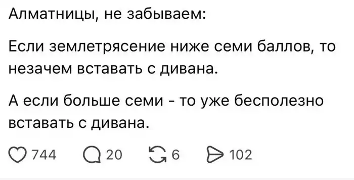 "Алматницы, не забываем: если землетрясение ниже семи баллов, то незачем вставать с дивана. А если больше семи — то уже бесполезно вставать с дивана", — пошутил один из пользователей сети.
