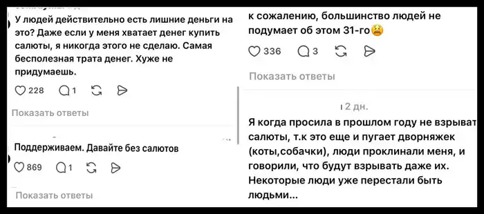 В комментариях также появились альтернативные идеи: "Лучше купите на эти деньги мясо". Многие поддержали это предложение, добавляя: "Давайте распространять по всем соцсетям: в этом году сознательно игнорируем салюты и петарды".
