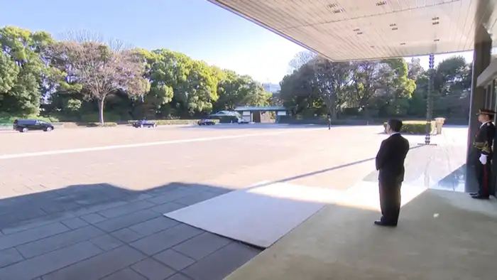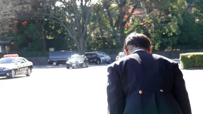 Президент прощается с Нарухито. Император смотрит вслед кортежу — до самых ворот. Офицеры у дворца по-прежнему неподвижны.