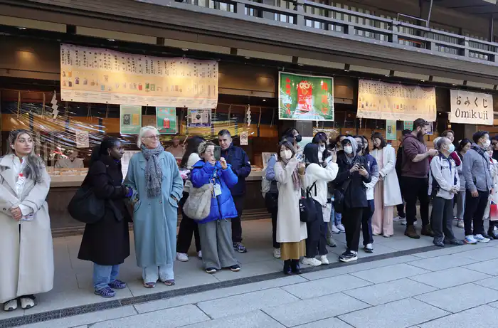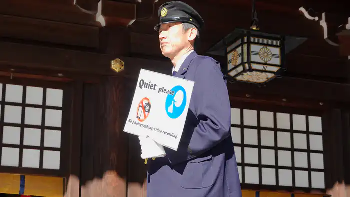 Гости храма замирают в ожидании того, ради кого сегодня выстроились камеры и служители. В Японии даже ожидание выглядит организованным.