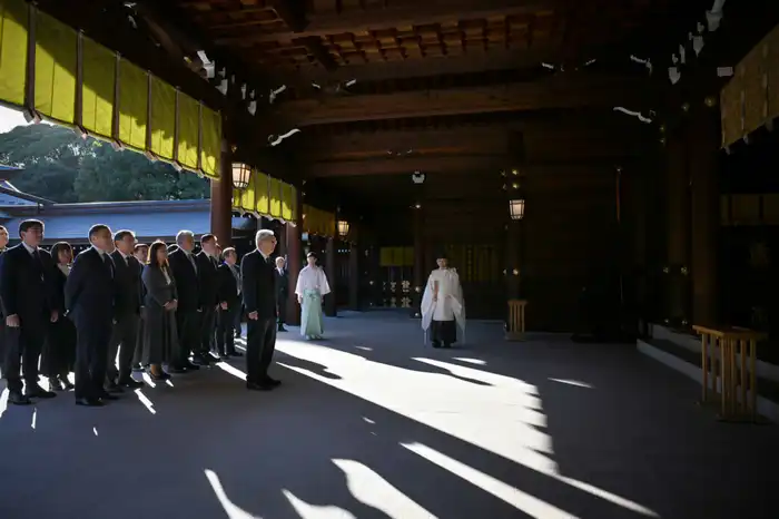 Программа визита меняет свой ритм — без дворцовых залов и протокольных пауз. Президент направляется в Мэйджи Дзингу — синтоистское святилище в самом центре Токио.