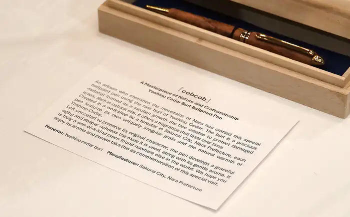 Каждый получил деревянный футляр с ручкой, изготовленной из редкой древесины японского кедра. В описании указывалось, что ручка со временем "привыкает" к руке владельца.