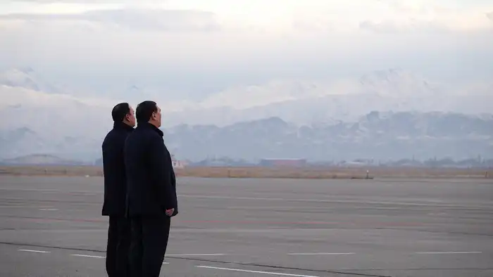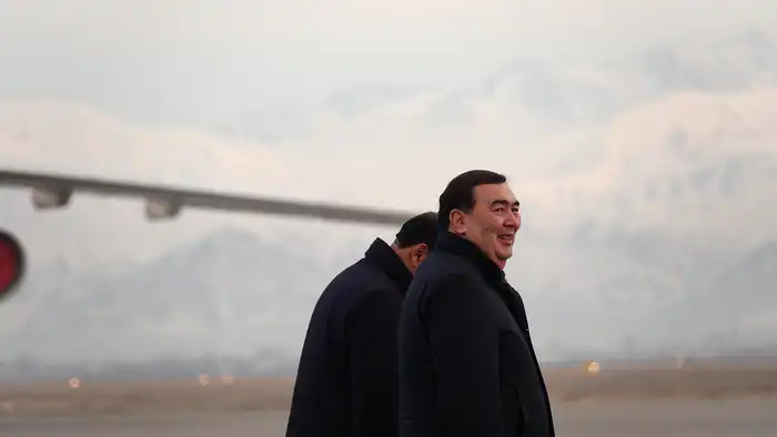 На лётном поле акимы провожали президентский борт, стоя смирно на фоне заснеженных гор.