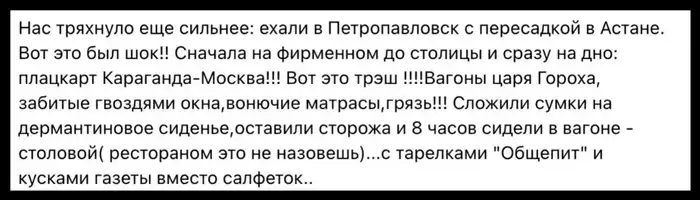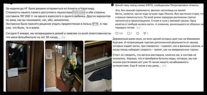 История началась с поста, где казахстанка описала, что её семья изначально планировала лететь на самолёте, но высокие цены на билеты — почти 197 тысяч тенге на взрослого и ребёнка — заставили их выбрать поезд. Однако условия в вагоне оказались, по её словам, не лучшими: старые вагоны, грязь, неприятный запах из туалетов, сквозняки из окон и всего одна розетка на вагон.