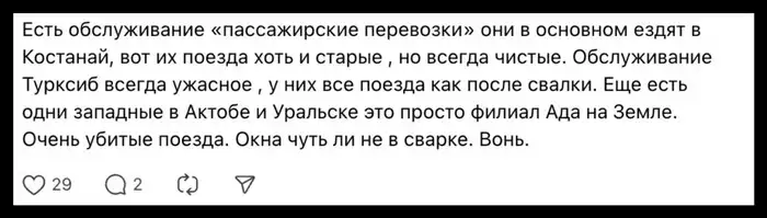 В комментариях к посту мнения разделились. Некоторые пользователи отметили, что состояние поездов в Казахстане варьируется в зависимости от маршрута и перевозчика. Они делились опытом поездок в "старых, но чистых" вагонах и рассказывали о случаях, когда попадали в изношенные составы с грязью и стойким запахом.
