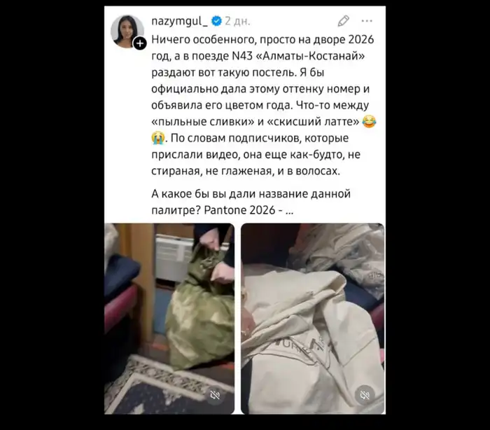 "Ничего особенного, просто на дворе 2026 год, а в поезде № 43 Алматы — Костанай раздают вот такую постель. Я бы официально дала этому оттенку номер и объявила его цветом года. Какое бы вы дали название данной палитре? Pantone 2026", — говорится в публикации.
