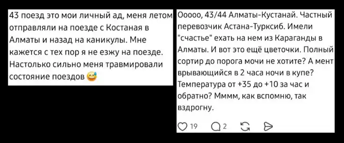 "43-й поезд — это мой личный ад. Летом отправляли из Костаная в Алматы и обратно на каникулы. Мне кажется, с тех пор я вообще не езжу на поезде", — добавил еще один пользователь.