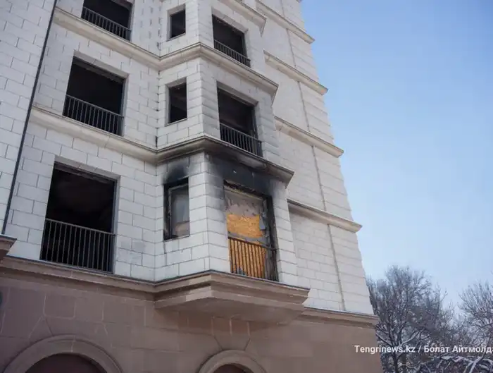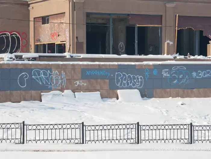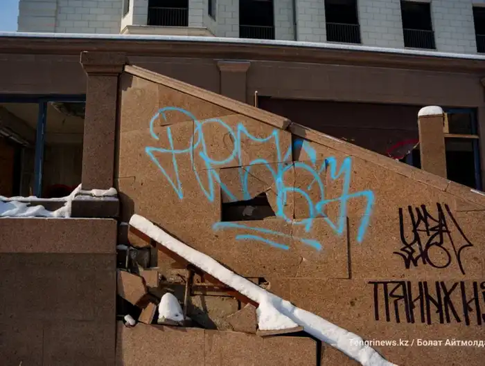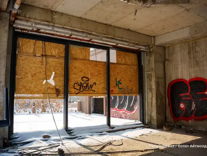 Состояние отеля Сатыбалды: разбитые окна и испорченный фасад на берегу реки Есентай в Алматы