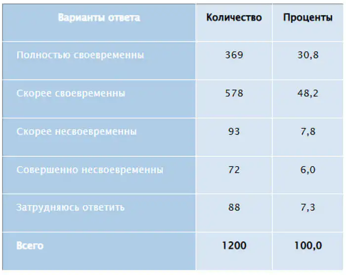 "Фокус внимания граждан на общественно-политические преобразования подтверждает, что проводимые реформы воспринимаются как своевременные. В совокупности так ответили 79 процентов опрошенных, из них 48,2 процента считают реформы 'скорее своевременными', а 30,8% – 'полностью своевременными'", — считают исследователи.