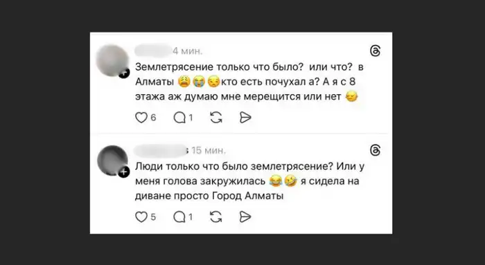 Алматинцы в социальных сетях пишут, что почувствовали землетрясение. По их словам, в отдельных районах ощущалась лёгкая вибрация и их "чуть качнуло". Сообщения о толчках начали появляться в различных соцсетях.