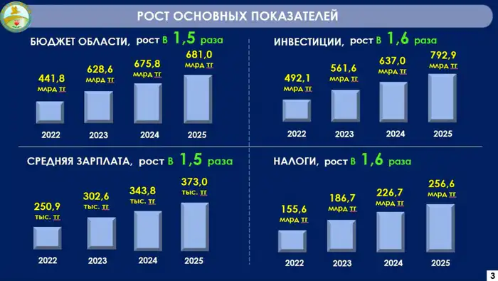 "За последние три года в регионе значительно выросли базовые экономические показатели. Областной бюджет и средняя заработная плата увеличились в 1,5 раза, инвестиции в основной капитал — в 1,6 раза. Объём прямых иностранных инвестиций за этот период составил 1,5 миллиарда долларов, а налоговые поступления выросли до 256,6 миллиарда тенге", — добавил аким области.