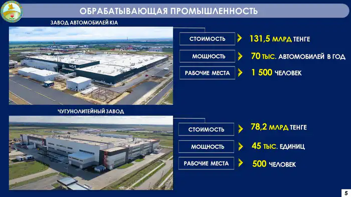 Объём промышленного производства в регионе достиг 3,5 триллиона тенге. Реализовано семь инвестиционных проектов на сумму 322,1 миллиарда тенге, что позволило создать 3,3 тысячи рабочих мест.