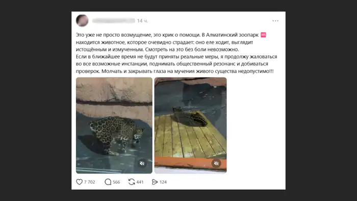 "Это уже не просто возмущение, это крик о помощи. В Алматинском зоопарке находится животное, которое очевидно страдает: оно еле ходит, выглядит истощённым и измученным. Смотреть на это без боли невозможно. Если в ближайшее время не будут приняты реальные меры, я продолжу жаловаться во всевозможные инстанции, поднимать общественный резонанс и добиваться проверок. Молчать и закрывать глаза на мучения живого существа недопустимо", – заявила автор поста.