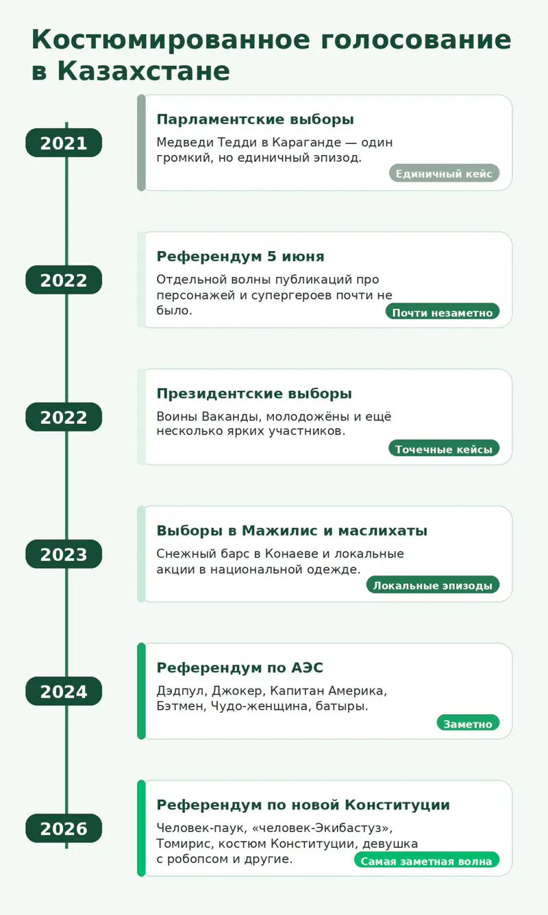 На референдуме по АЭС 6 октября 2024 года таких историй стало больше. Tengrinews.kz тогда рассказывал о группе астанчан в костюмах супергероев: Дэдпул, Джокер, Капитан Америка, Бэтмен, Чудо-женщина. А ещё в тот раз голосовали батыр и девушка в национальном платье. То есть феномен уже набирал обороты, но по медийному масштабу выглядел скромнее, чем нынешний.