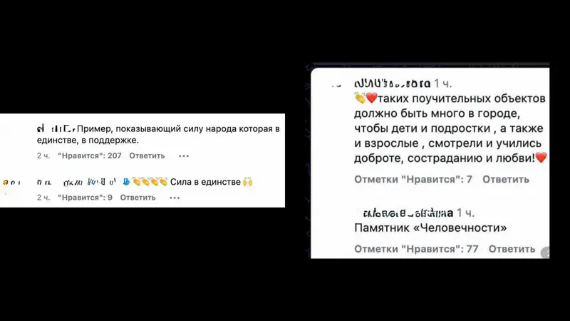 "Очень неожиданно и круто!", "Памятник человечности", "Таких поучительных объектов должно быть много в городе, чтобы дети и подростки, а также и взрослые смотрели и учились доброте, состраданию и любви!", "Как же круто!", "Пример, показывающий силу народа, которая в единстве, в поддержке", "Запечатление таких моментов делает город таким родным", — написали комментаторы в сети.