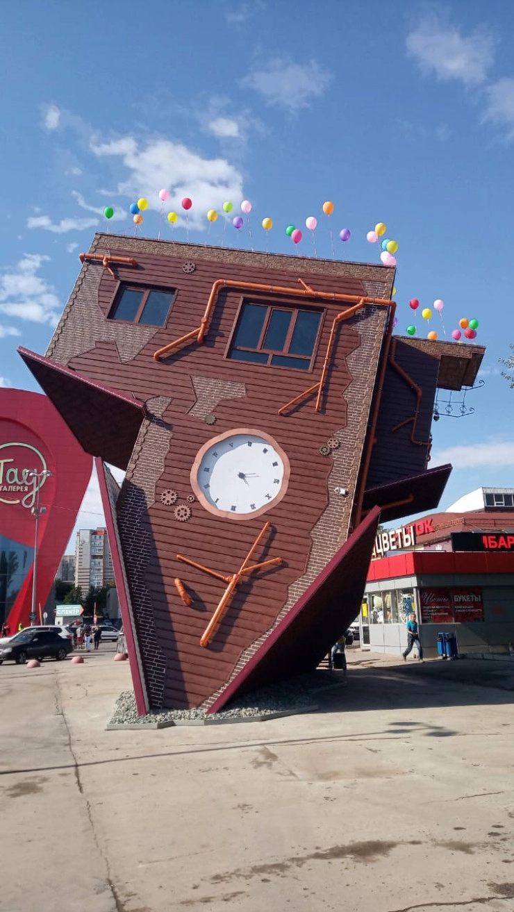 "Дело в том, что мы строили его изначально горизонтально, как обычный дом. После уже двумя кранами перевернули его и установили. Это еще раз подчеркивает крепкость, устойчивость и надежность конструкции", - добавил собственник объекта.